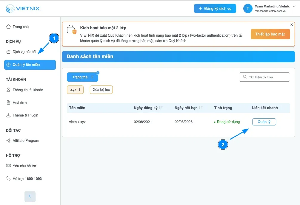 Bước 2: Nhấn vào thanh tác vụ Quản lý tên miền ở bên trái > Sau đó chọn Quản lý ở tên miền bạn muốn trỏ về Email Doanh Nghiệp.